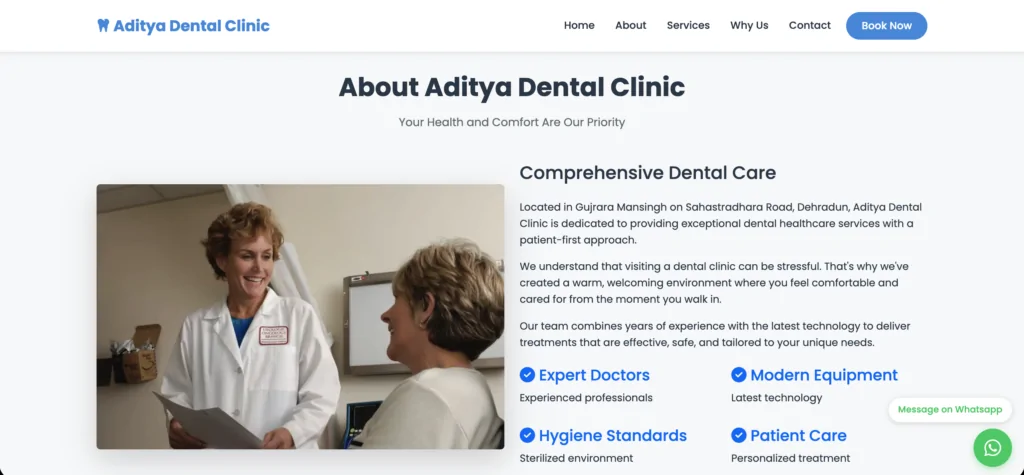 Clean and modern website for Aditya Dental Clinic highlighting treatments and patient care.